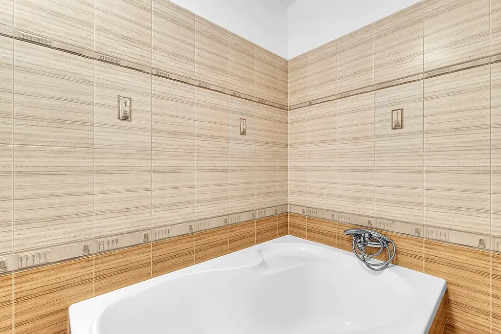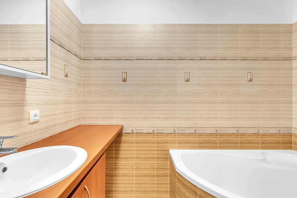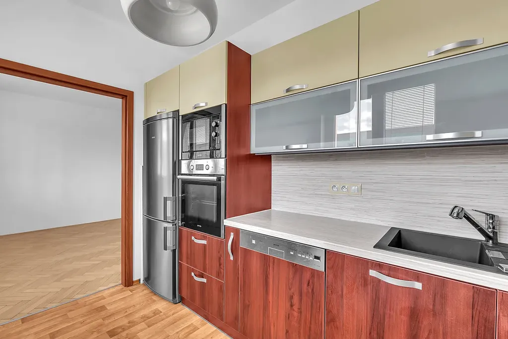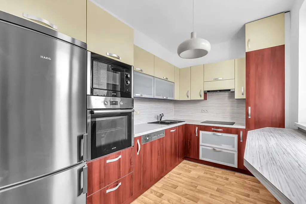 Zařízená kuchyňská linka (vysoká lednice AEG, vestavěná mikrovlnná trouba a elektrická trouba Gorenje, myčka nádobí, sklokeramická deska, digestoř)