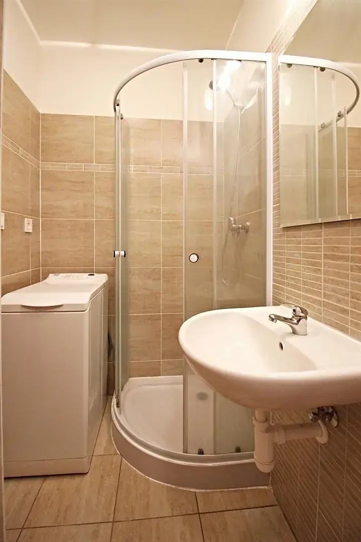 Koupelna je vybavena sprchovým koutem, umyvadlem se skříňkou, toaletou a pračkou.