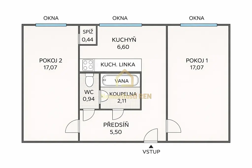 Byt o celkové ploše 53 m2, má praktickou dispozici s neprůchozími pokoji, což zajišťuje dostatek soukromí a pohodlí pro každodenní bydlení. Dispozice je vhodná jak pro vlastní bydlení, tak i jako investice k pronájmu.