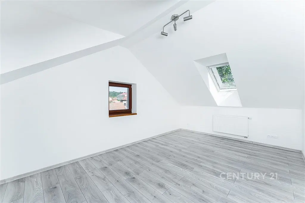 Dům je po rekonstrukci vnitřní i vnější, zateplený, s novou fasádou a střechou. Vznikly zde 3 byty, z nichž tento má spoustu zajímavých prostorových vychytávek a tu největší kuchyň. Kromě kuchyňské linky se spotřebiči je nezařízený a je jen na vás, jak si prostor po svém zabydlíte. Vstupní dveře do bytu jsou ve druhém patře a schodiště je už součástí bytu. Na odpočívadle je komora s plynovým kotlem a k odkládání věcí.