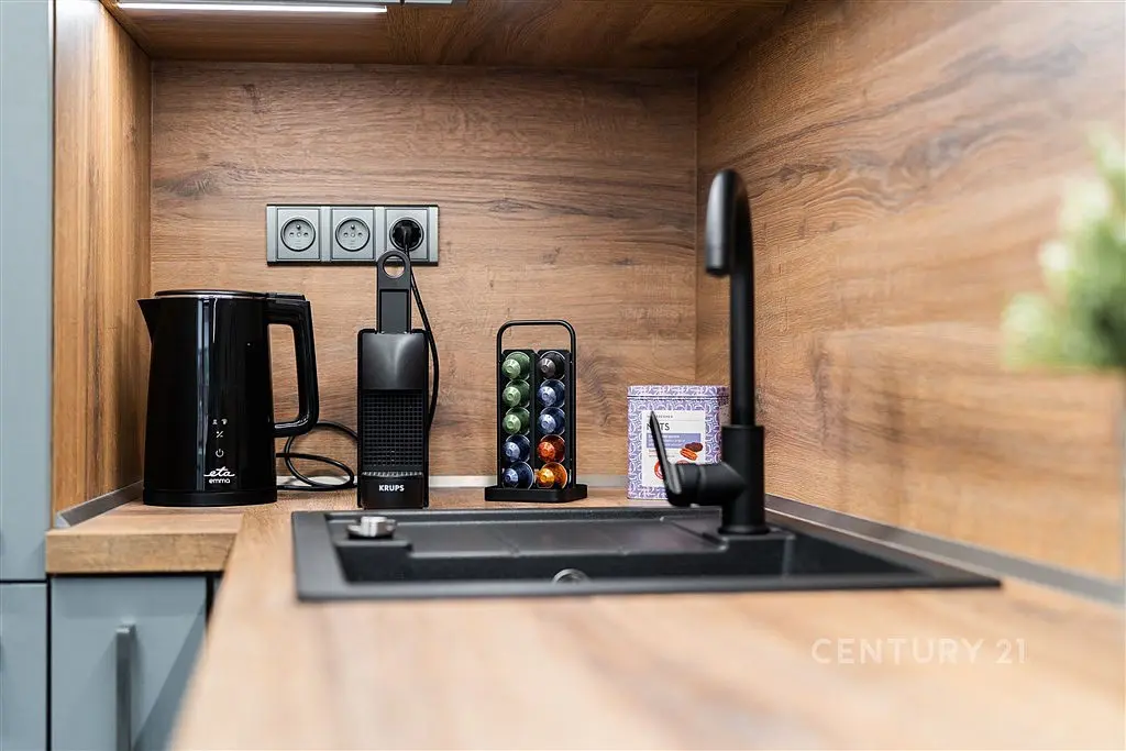 Je kompletně vybaven a zařízen: kuchyňská linka na míru včetně vestavěných spotřebičů (vysoká lednice s mrazákem, indukční varná deska, mikrovlnka, trouba, digestoř, myčka nádobí), jídelního stolu, židlí, sedačky, TV skříňky, vestavěnou skříní s pračkou a samostatnou sušičkou v předsíni, pracovním koutem, vestavěnými skříněmi a postelí box spring v ložnici.