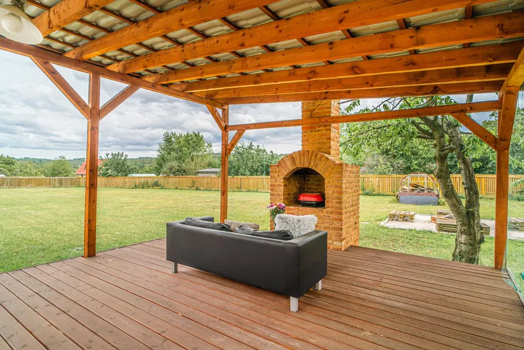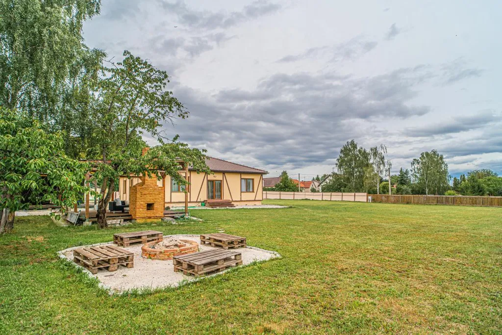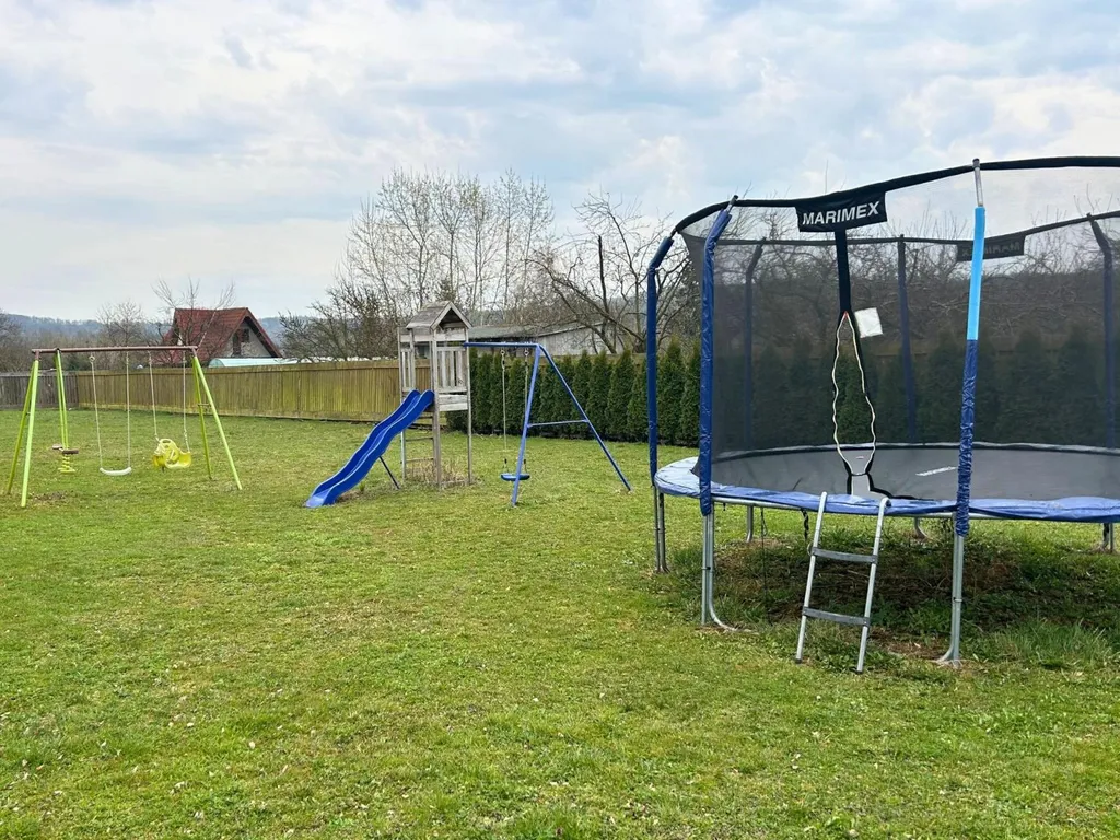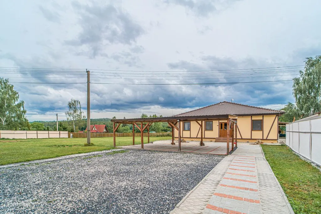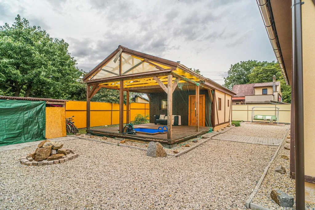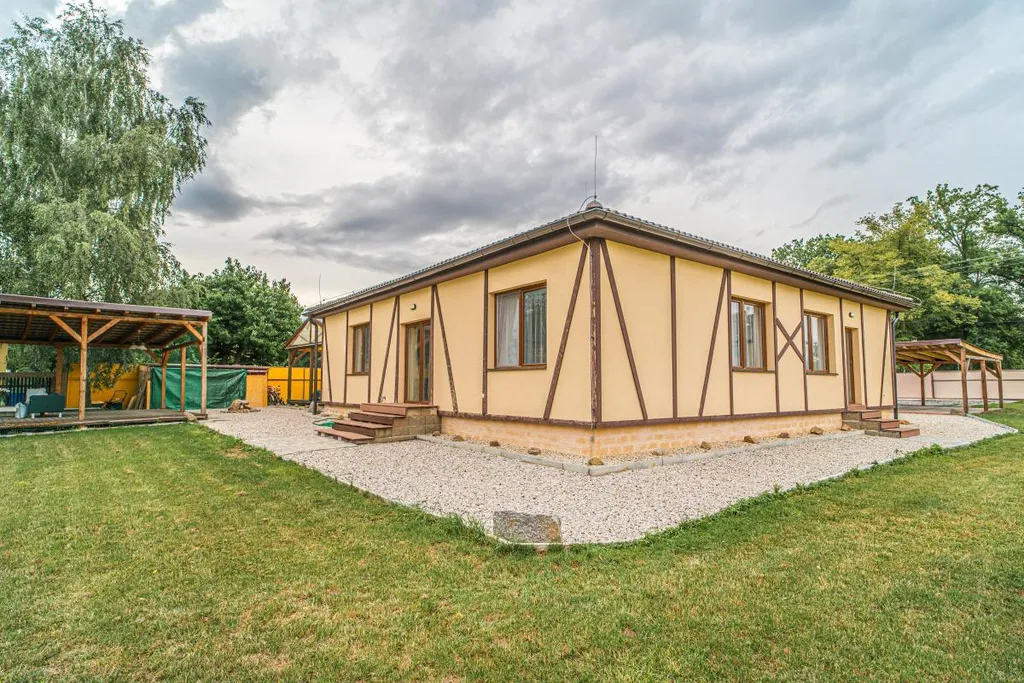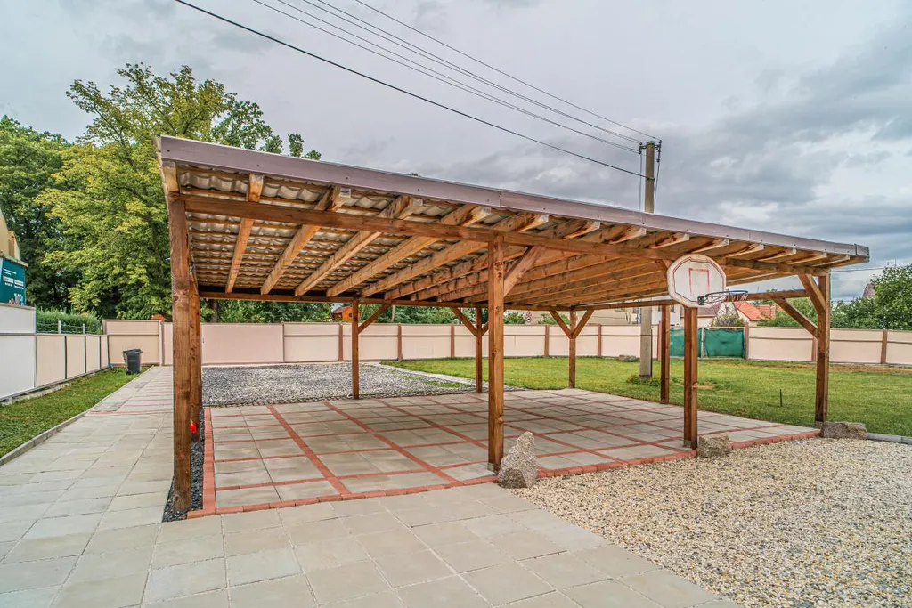 Pozemek je kompletně oplocený, převážně travnatý, částečně se zpevněnými plochami, a nabízí dostatek prostoru pro odpočinek, rodinné aktivity i zahradní využití. Vjezd na pozemek je zajištěn pojezdovou bránou. Parkování je možné na zastřešené zpevněné ploše až pro 3 osobní automobily.