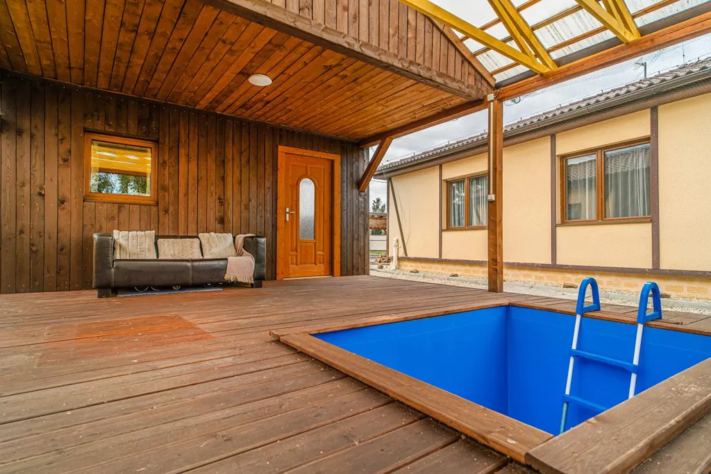 Součástí venkovního zázemí je také sauna s vlastní koupelnou, odpočinkovou místností a venkovním studeným bazénkem. Ohřev sauny zajišťují kamna na tuhá paliva.