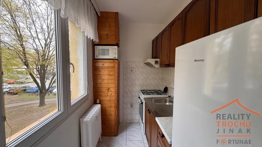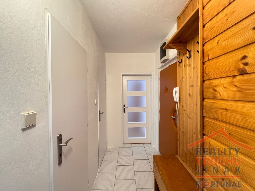 Dispozice: 2 obytné místnosti, kuchyňský kout, koupelna (vana), WC, sklepní kóje. Vytápění: ÚT – dálkové, podlahy: dlažba a v ložnici plovoucí podlaha. Vybavení bytu: lednice s mrazákem, mikrovlnná trouba, digestoř, kombinovaný sporák, sedací souprava, křeslo, obývací stěna, TV, šatní skříň + skříňky. Možnost pronájmu i bez vybavení nábytkem. Parkování u domu.