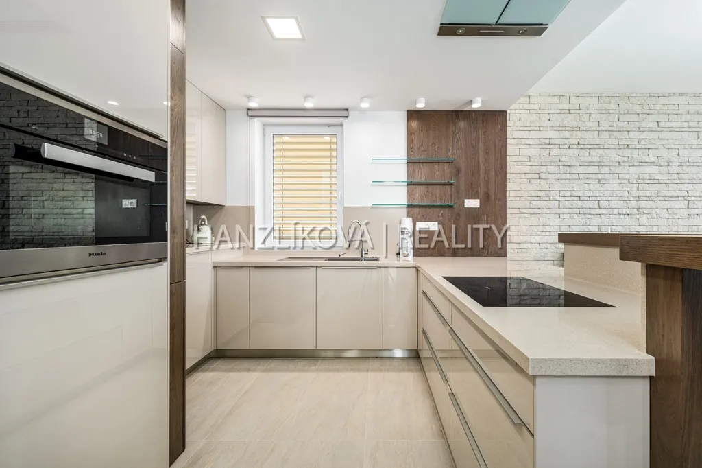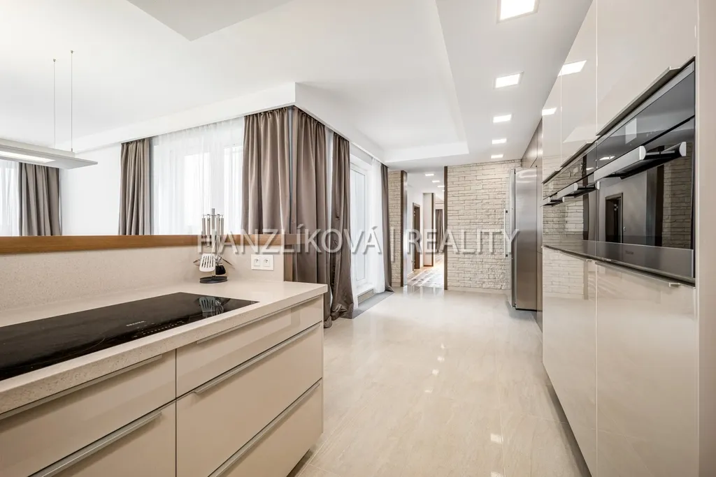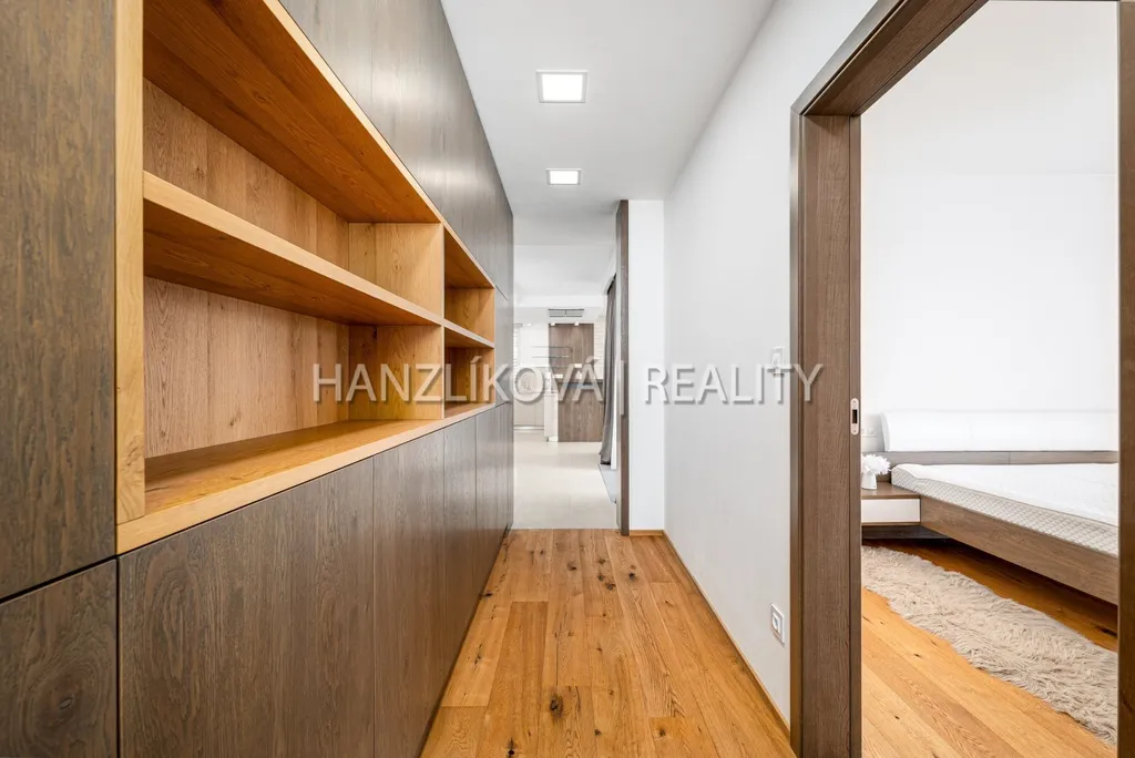 Dispozice dále nabízí několik pokojů, ložnici, pracovnu se zabudovaným trezorem, dvě koupelny, dvě samostatné toalety a technickou místnost (prádelnu). Celý byt je řešen velmi prakticky s důrazem na dostatek úložných prostor a komfortní každodenní fungování i pro větší rodinu.