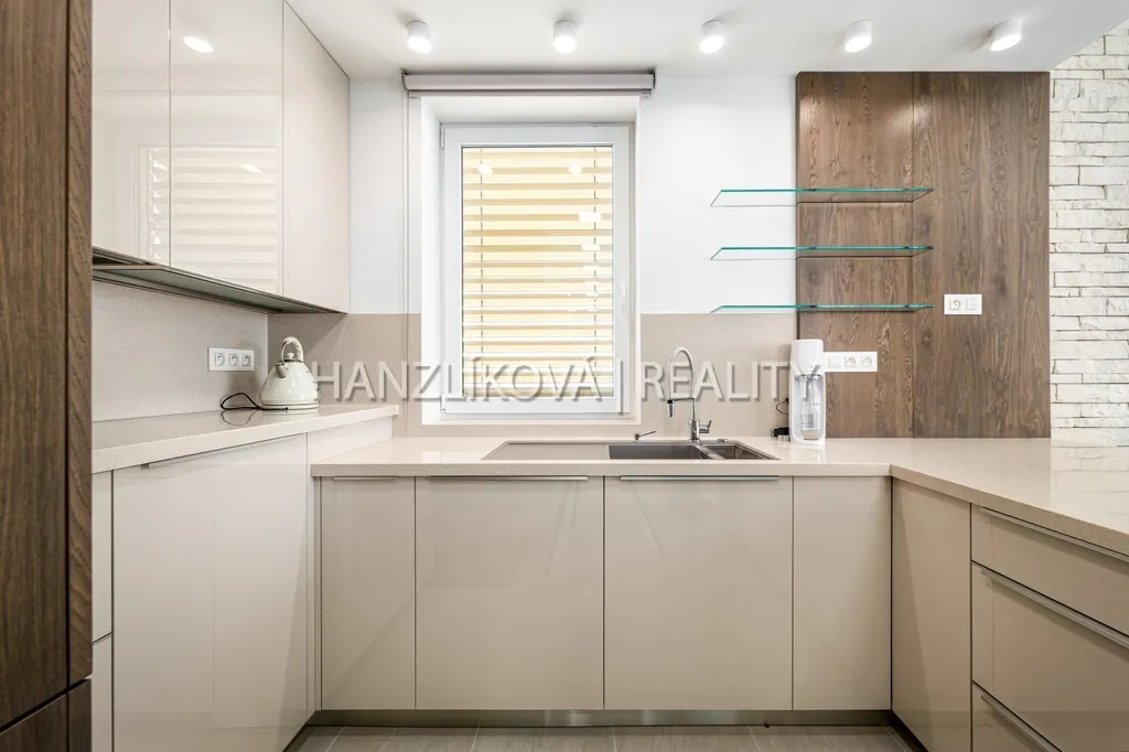 Interiér je ve vysokém standardu – kuchyňská linka a vestavěný nábytek od výrobce Hanák, použity byly kvalitní materiály jako dýha, podlahy jsou řešeny kombinací dřevěných dubových parket a vinylu. Samozřejmostí jsou spotřebiče MIELE, bezfalcové dveře, designové osvětlení, klimatizace a venkovní žaluzie. Vytápění je řešeno klasickými radiátory, v koupelnách je navíc podlahové topení. Terasy jsou vybaveny bezúdržbovými prkny WPC Woodplastic.