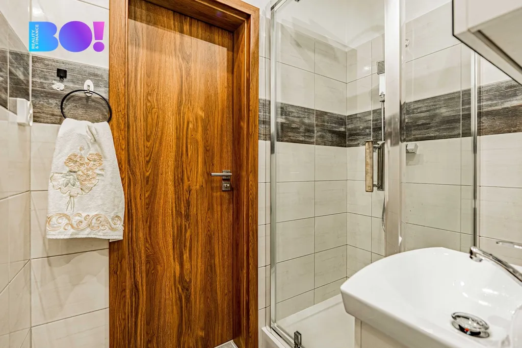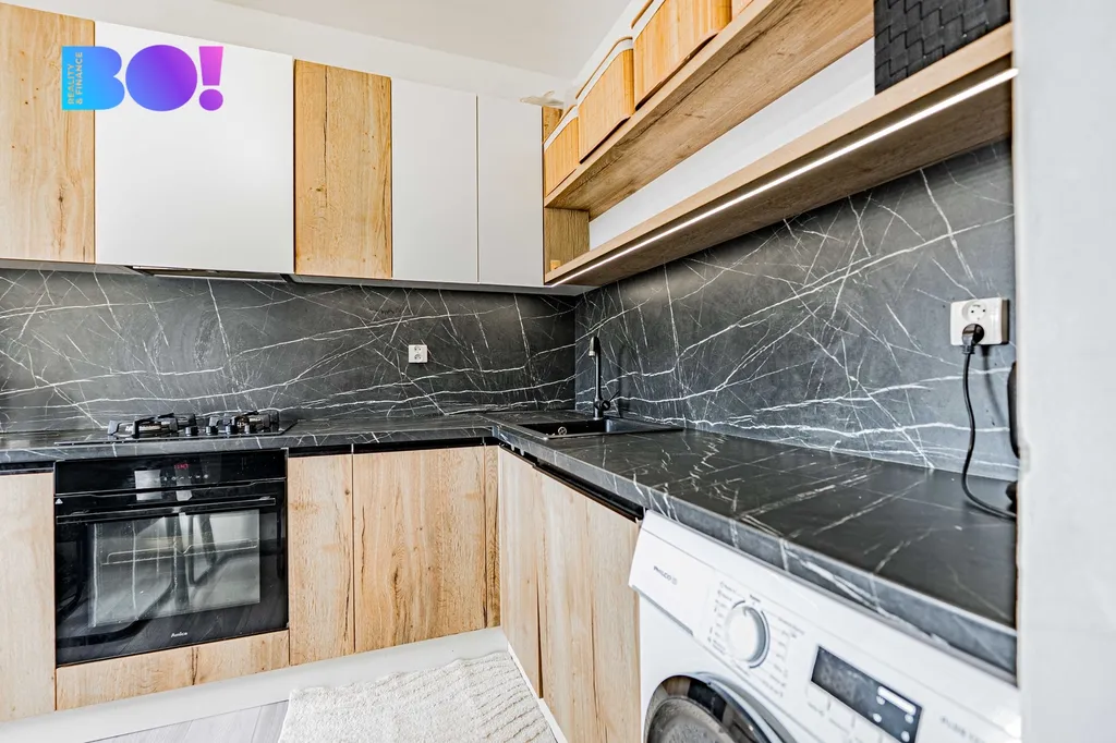 Dispoziční řešení je promyšlené a působí velmi vzdušně. Vstupní předsíň je vybavena vestavěnými skříněmi, které elegantně řeší dostatek úložného prostoru. Koupelna je spojena s toaletou a laděna do čistého, moderního stylu. Kuchyně je vybavena spotřebiči a přirozeně navazuje na obývací část bytu. Samostatný pokoj slouží jako ložnice a dotváří praktické uspořádání celého prostoru.