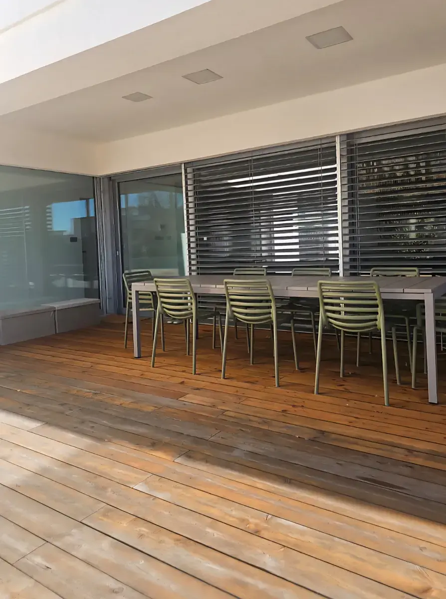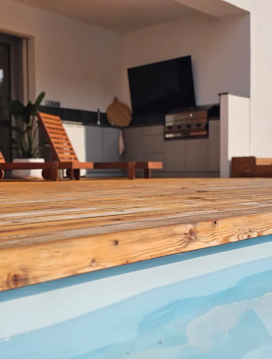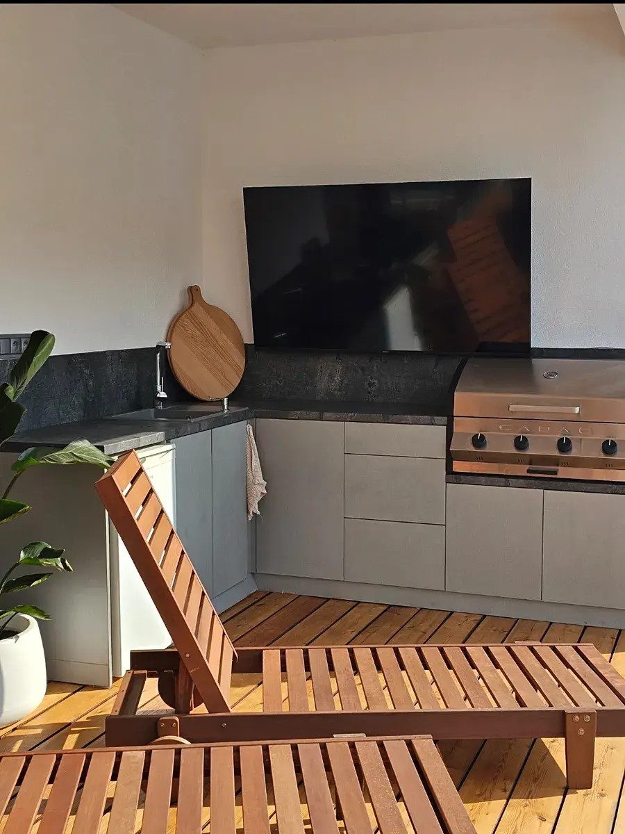 Součástí terasy ze sibiřského modřínu je venkovní kuchyně včetně grilu.
