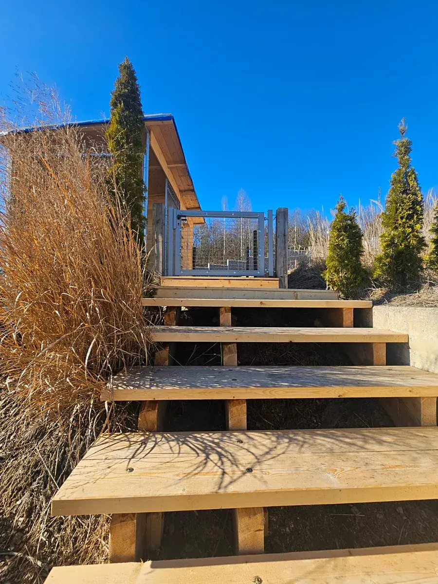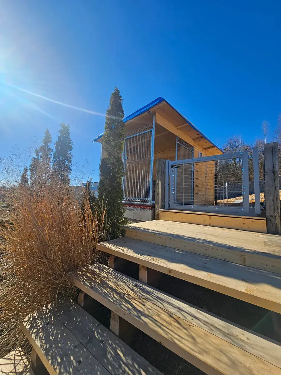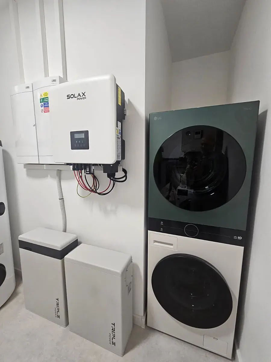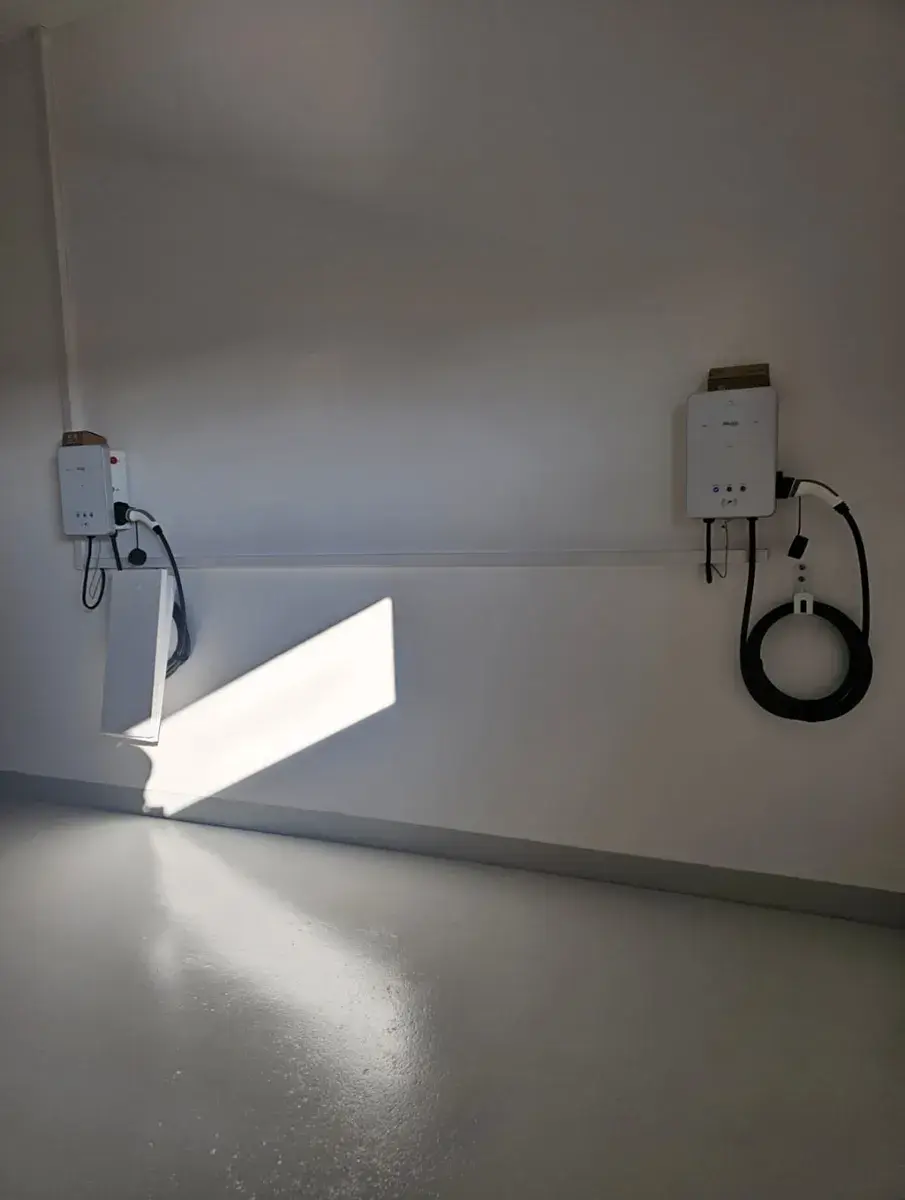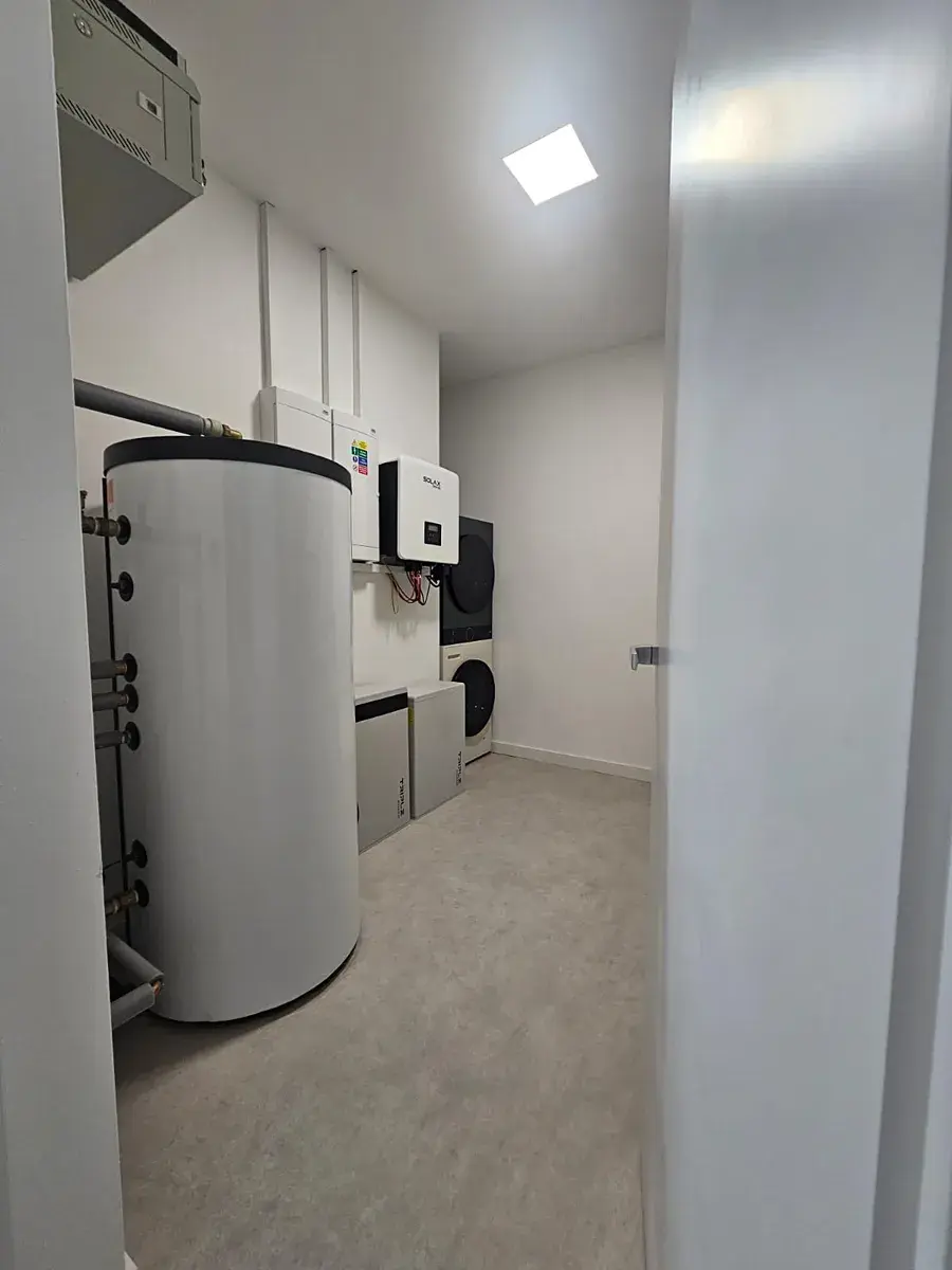 Součástí domu je fotovoltaická elektrárna, tepelné čerpadlo voda/vzduch a dvě nabíjecí stanice pro automobily umístěné v prostorné garáži.