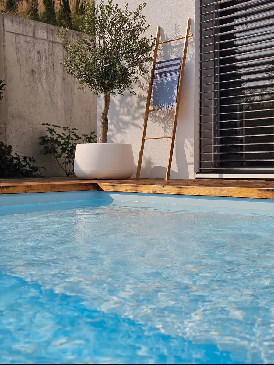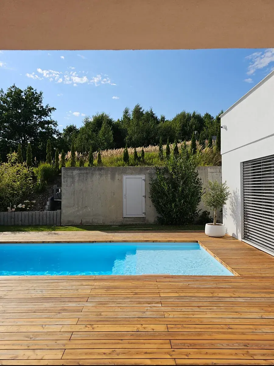 Venkovní bazén se slanou vodou o rozměrech 8x3 m je vytápěn vlastním tepelným čerpadlem.