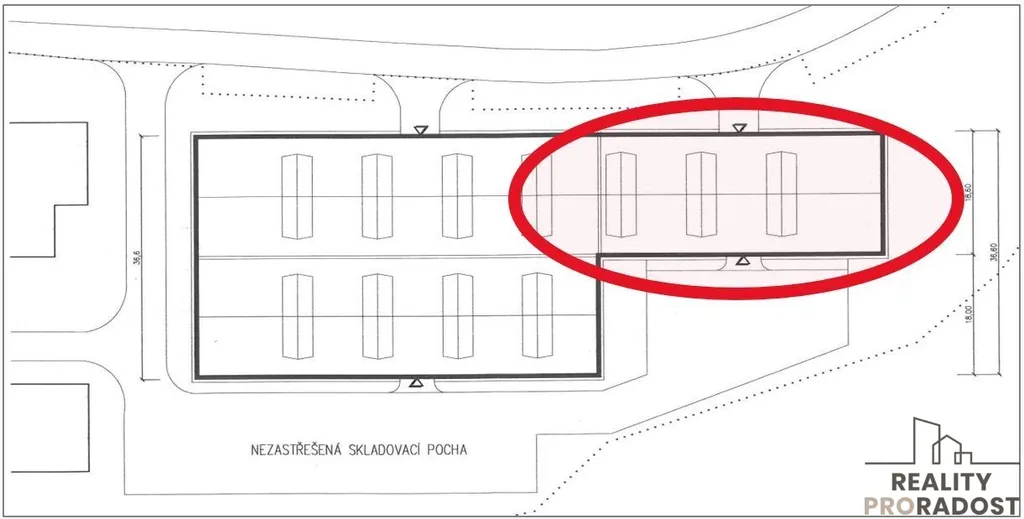 Jedná se o jeden velký prostor haly do které je pohodlný příjezd kamionem. Okolo haly je rovněž dostatek prostoru pro manipulaci na volných plochách.