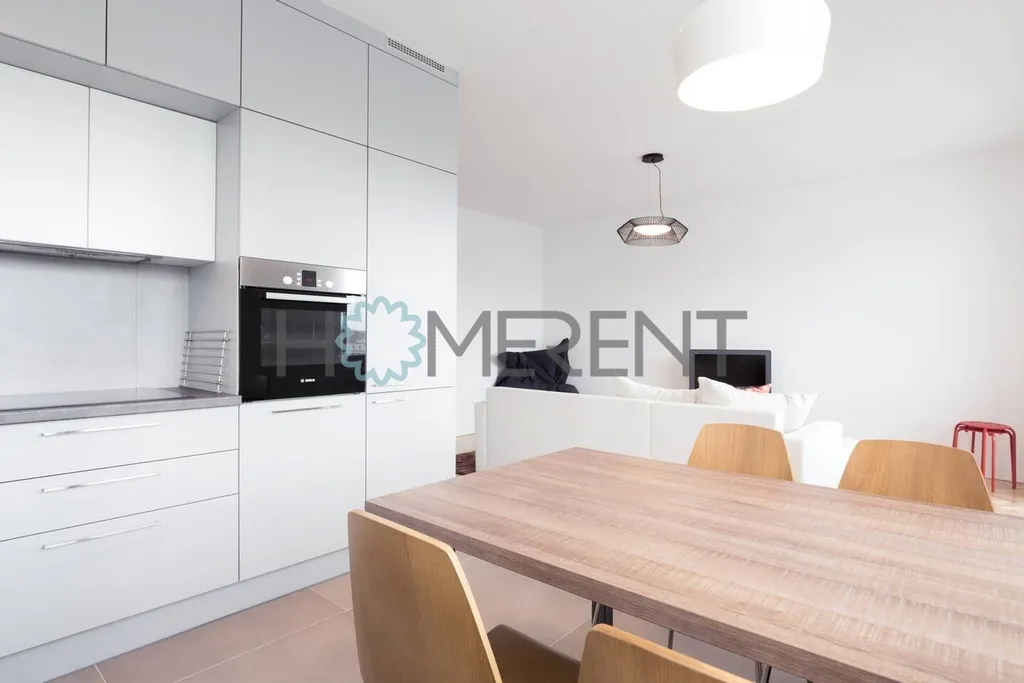Interiér je zařízen moderním nábytkem, dominantou jsou krásné dřevěné podlahy, které dodávají bytu elegantní a nadčasový vzhled. Kuchyně je plně vybavena spotřebiči včetně lednice s mrazákem, myčky, trouby, varné desky, digestoře a kompletního nádobí.