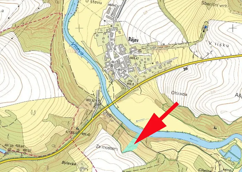 Pozemek je poblíž břehu Vltavy a je skvěle dostupný z obecní asfaltové silnice.