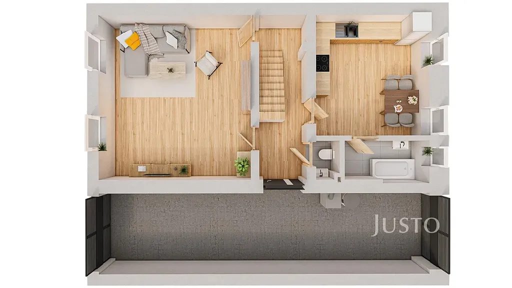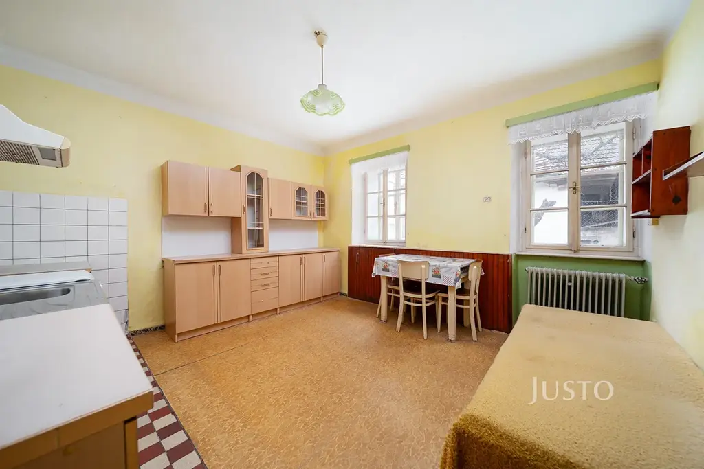 V přízemí se nachází obývací pokoj, kuchyně, koupelna a samostatné WC. Součástí domu je také průjezd, který může sloužit jako kryté parkování, dílna nebo praktické zázemí. Zároveň tudy projdete na uzavřený dvorek, který nabízí soukromí a prostor pro venkovní posezení.
