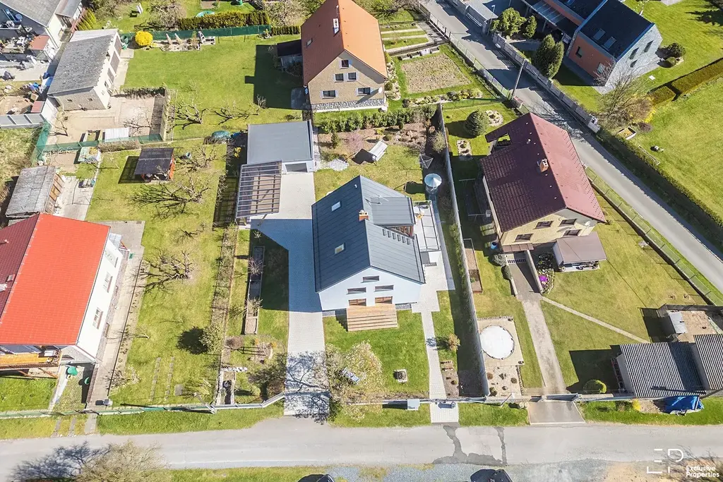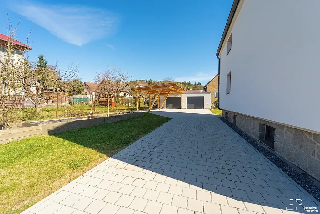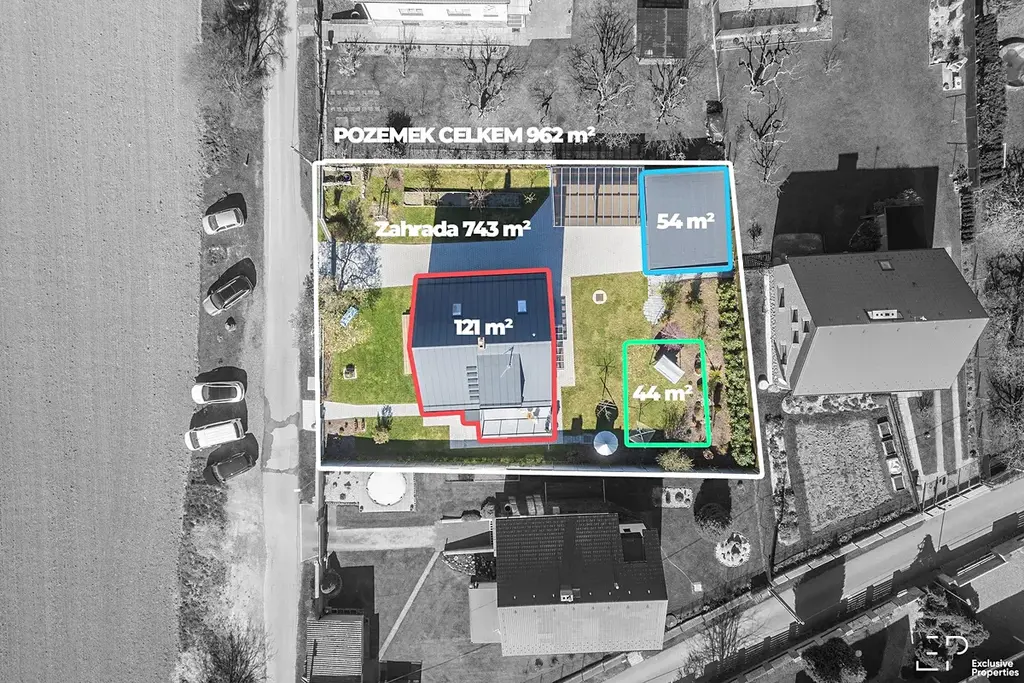 Celková výměra pozemku činí 962 m², z toho zastavěná plocha domu je 121 m². Součástí je také dvougaráž o velikosti 54 m², zastřešené parkovací stání pro dvě vozidla a udržovaná zahrada o výměře 743 m². Na pozemku se navíc nachází volná stavební parcela o velikosti 44 m², která nabízí další potenciál pro rozšíření.