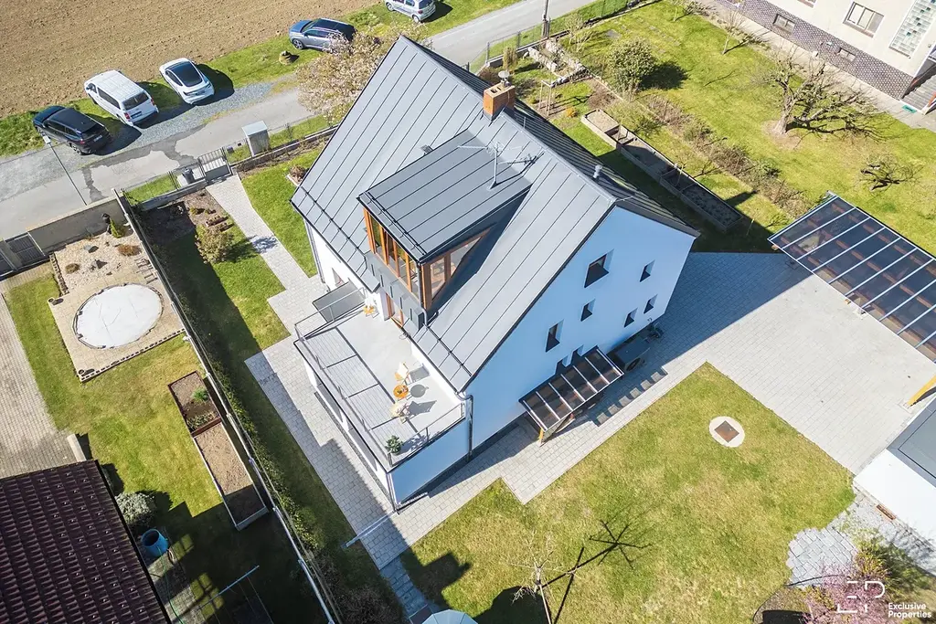 Velkou výhodou je podzemní podlaží s denním světlem, které lze snadno využít jako samostatnou bytovou jednotku, reprezentativní pracovnu nebo zázemí pro podnikání.