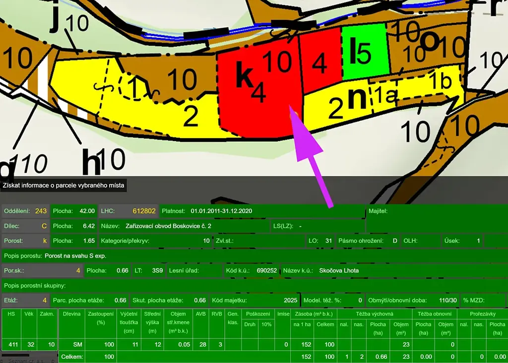 Porost: Smrk 40 let, zásoba cca 120 m3