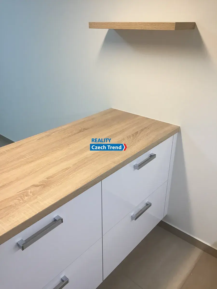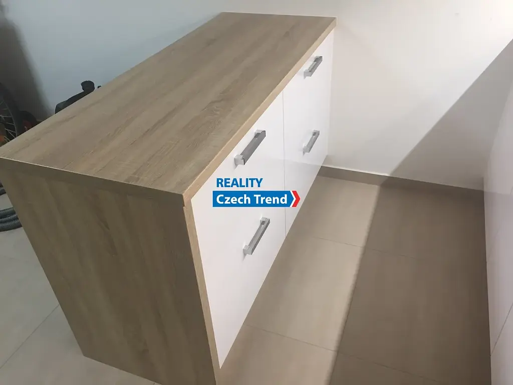 Interiér je vybaven moderní kuchyňskou linkou na míru s vestavnými spotřebiči, jídelním stolem se židlemi a prostornou šatní skříní – stačí se jen nastěhovat a bydlet.
