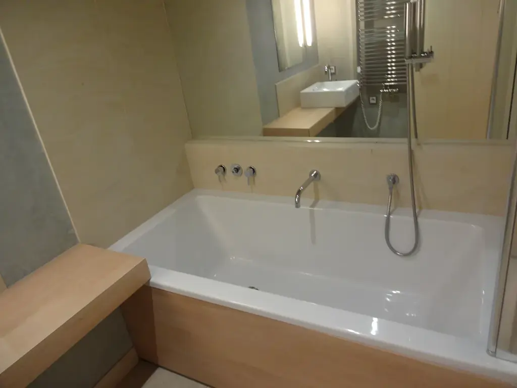 Dále byt disponuje koupelnou s vanou a topným žebříkem, samostatnou toaletou s umyvadlem a komorou, kde je umístěna pračka.