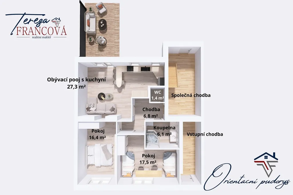Byt dále disponuje dvěma samostatnými pokoji, koupelnou a dostatkem prostoru pro úložná řešení.