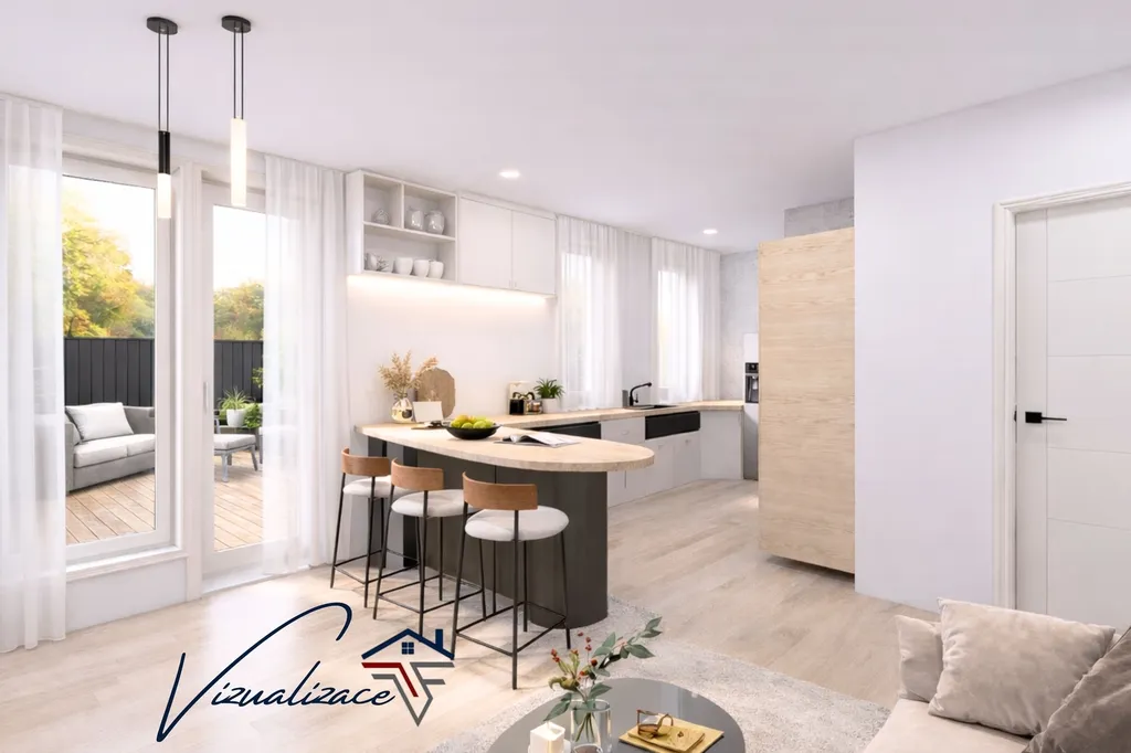 Dominantou bytu je prostorný obývací pokoj s kuchyňským koutem, ze kterého je přímý vstup na terasu a navazující zahradu. Právě tento prvek dělá z bytu výjimečné místo k bydlení – nabízí prostor pro relax, posezení s rodinou i bezpečné zázemí pro děti.