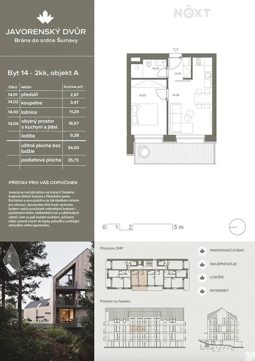 Nabízíme apartmán 2+kk o celkové ploše 38 m² s lodžií 5,96 m² a krásným výhledem do přírody. Součástí ceny je sklepní kóje (2,2 m²) a venkovní parkovací stání.