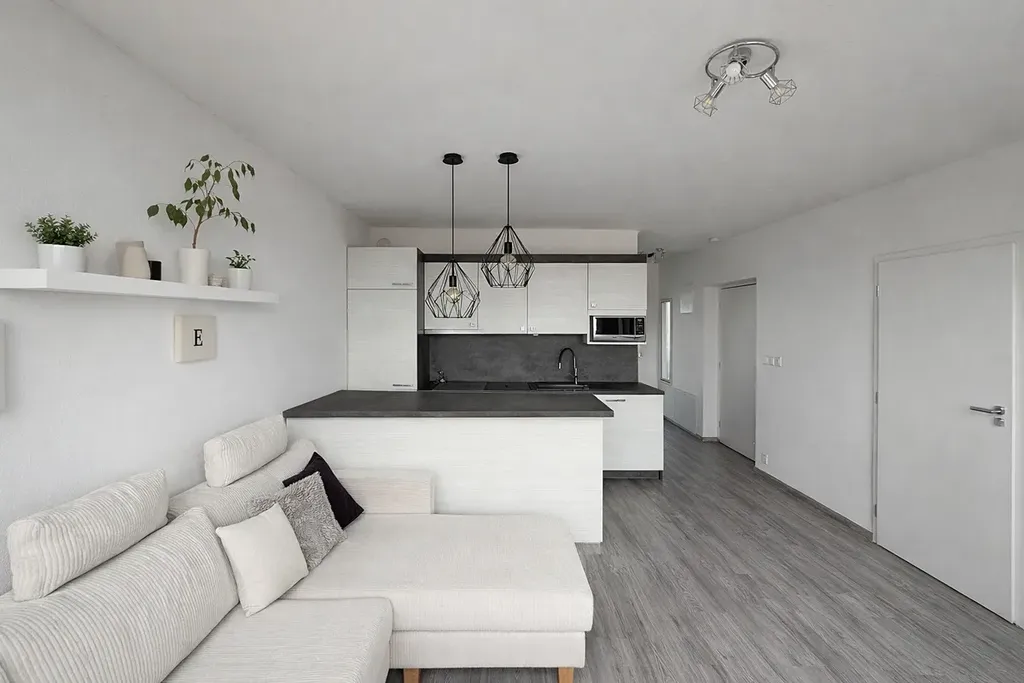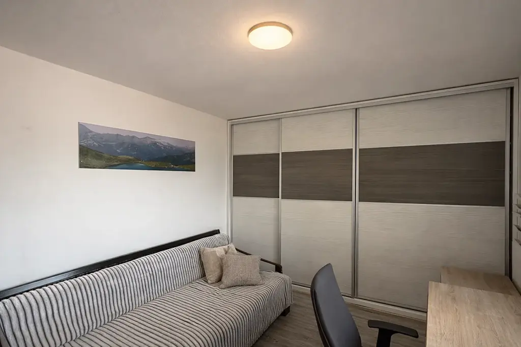 Dispozice bytu je velmi praktická – obývací pokoj s kuchyňským koutem tvoří hlavní obytný prostor, ložnice je doplněna o samostatnou šatnu, která výrazně zvyšuje komfort bydlení a nabízí dostatek úložného prostoru.