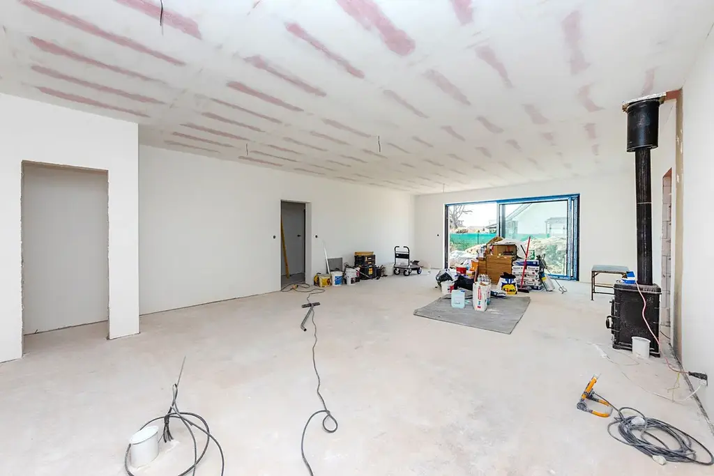 V obývacím pokoji příprava pro krb, nebo krbová kamna.