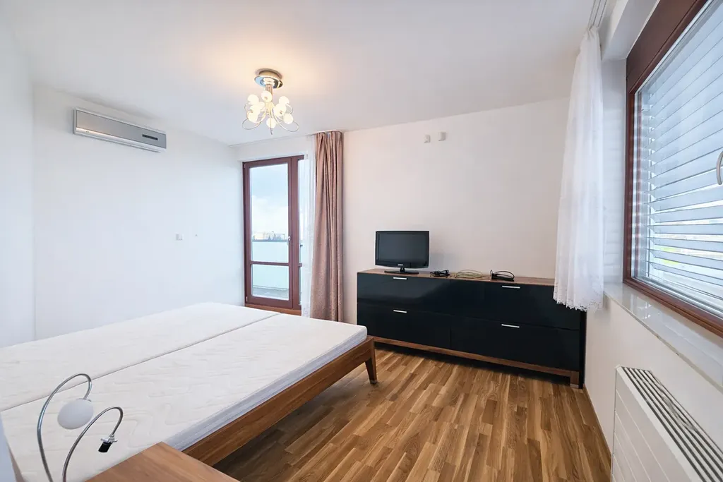 Podlahové krytiny tvoří kvalitní parkety a dlažba. Velkým benefitem je prostorná terasa, na kterou je vstup z pokojů i ložnice. Samozřejmostí je klimatizace, videotelefon, venkovní žaluzie a další nadstandardní vybavení.K bytu je možné mít za připlatek 2 parkovací stáni,