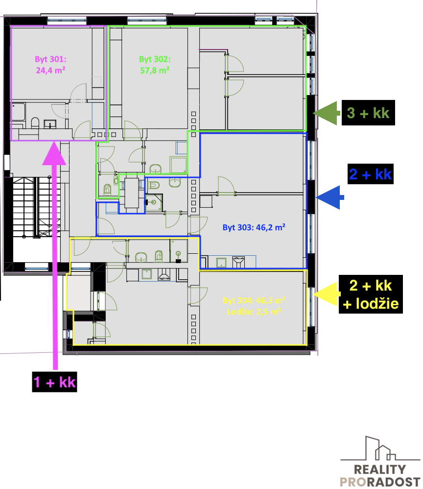 Tento typ bytu (1+kk) je v domě k dispozici ve více variantách: