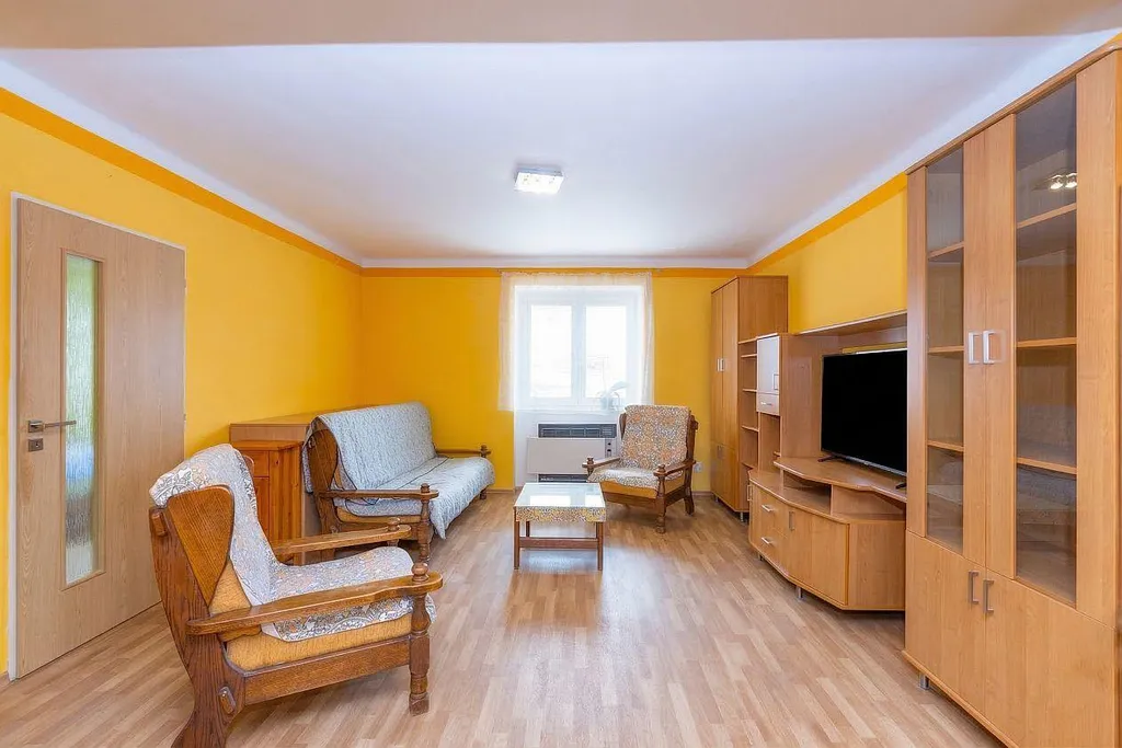 Pronájem je včetně vybavení (lednička, pračka, sporák, jídelní stůl se židlemi, obývací stěna, křesla, pohovka, botník, věšák, šatní skříň).
