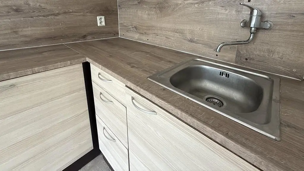 Vstupními dveřmi vejdeme do bytu a ocitneme se v předsíni o výměře cca 1,62 m². Kuchyně o velikosti cca 12,10 m² je vybavena kuchyňskou linkou, lednicí, mikrovlnnou troubou a sporákem. U kuchyňské linky je přívod na pračku. Součástí kuchyně je spíž s regálem, pro úschovu například suchých potravin, spíž má výměru cca 0,66 m². Z kuchyně dále vejdeme do hlavní obytné části o výměře 17,00 m². Jedná se o atypický a moc pěkný pokoj. Koupelna o výměře cca 3,50 m² je spojená s WC. Její součástí je vana, umyvadlo, zrcadlo a plynový ohřívač na teplou vodu.
