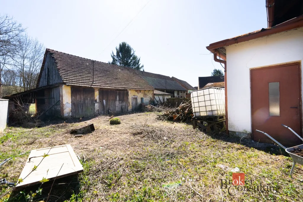 Pozemek tvoří dvě navazující parcely o výměře 551 m² a 450 m², celkem tedy 1 001 m². Přilehlá stodola rovněž čeká na rekonstrukci a nabízí možnost dalšího využití — pro hospodářské účely, skladování nebo přestavbu.