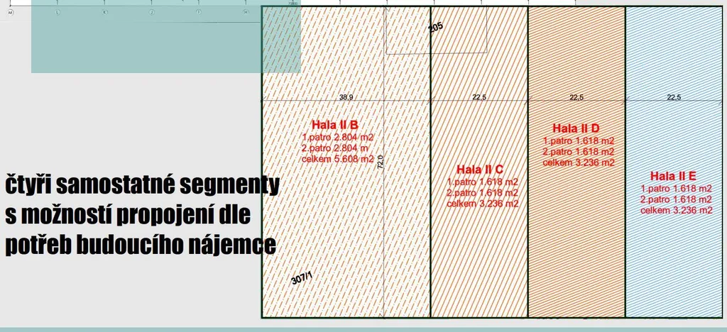 Velikost hal od 3 236 m2 ( celkem 3x ) .... nebo jako celek.