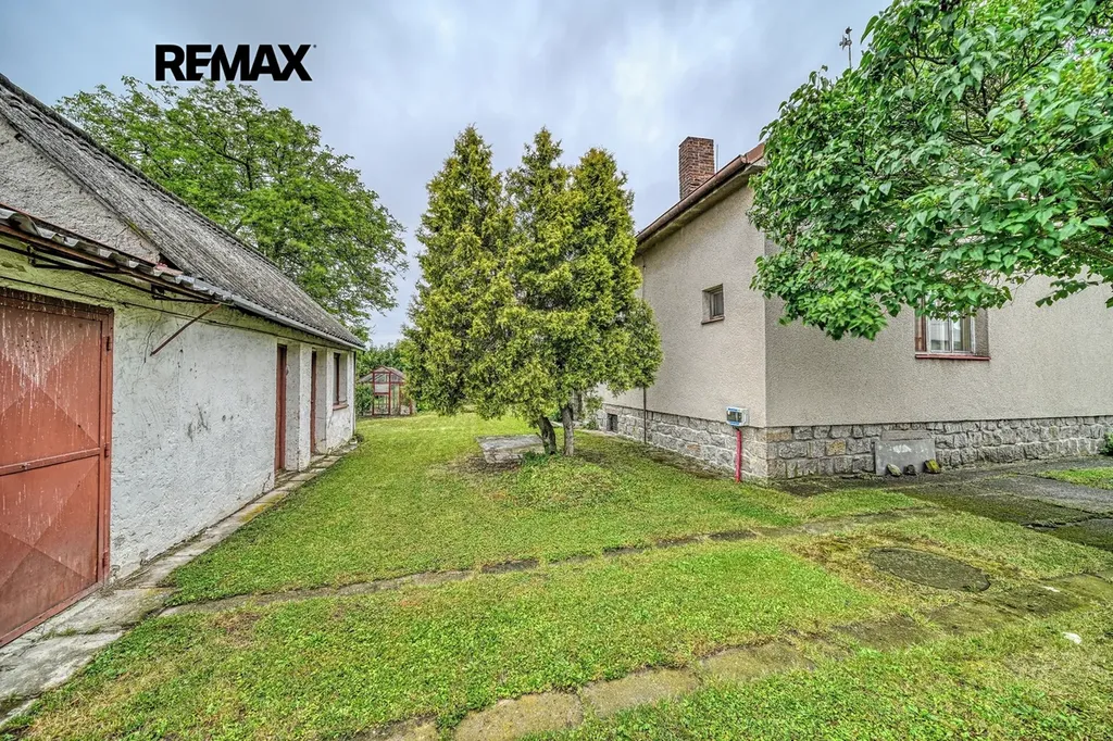 Na zahradě jsou vzrostlé stromy, garáž s dílnou a skleník. Je zde dostatek prostoru pro zahradničení, odpočinek nebo vybudování bazénu a posezení.