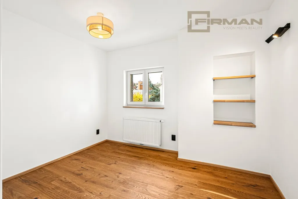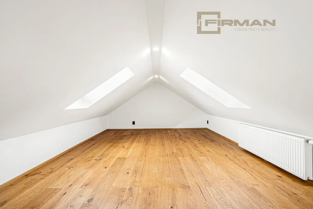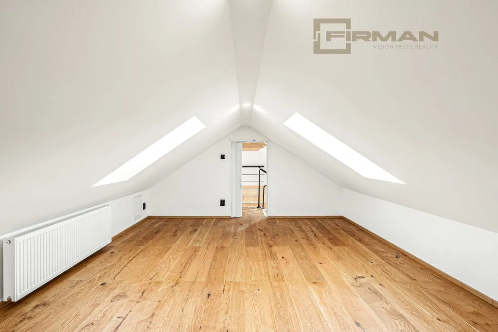 Horní byt zaujme otevřeným obývacím prostorem s novou kuchyní, vysokými stropy a přiznanými trámy. Samozřejmostí jsou moderní spotřebiče a dálkově ovládané střešní žaluzie. Součástí je také podkrovní místnost vhodná jako ložnice, pracovna nebo úložný prostor.