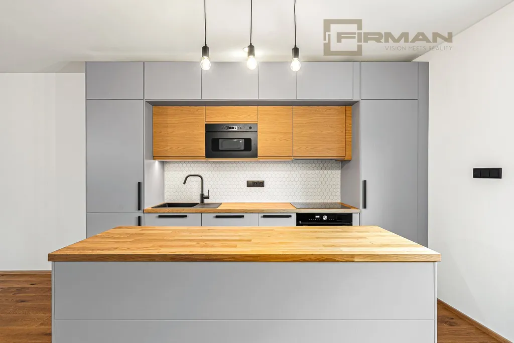 Spodní byt je proveden ve stejném standardu – nová kuchyně, kvalitní materiály a důraz na funkčnost i komfort.