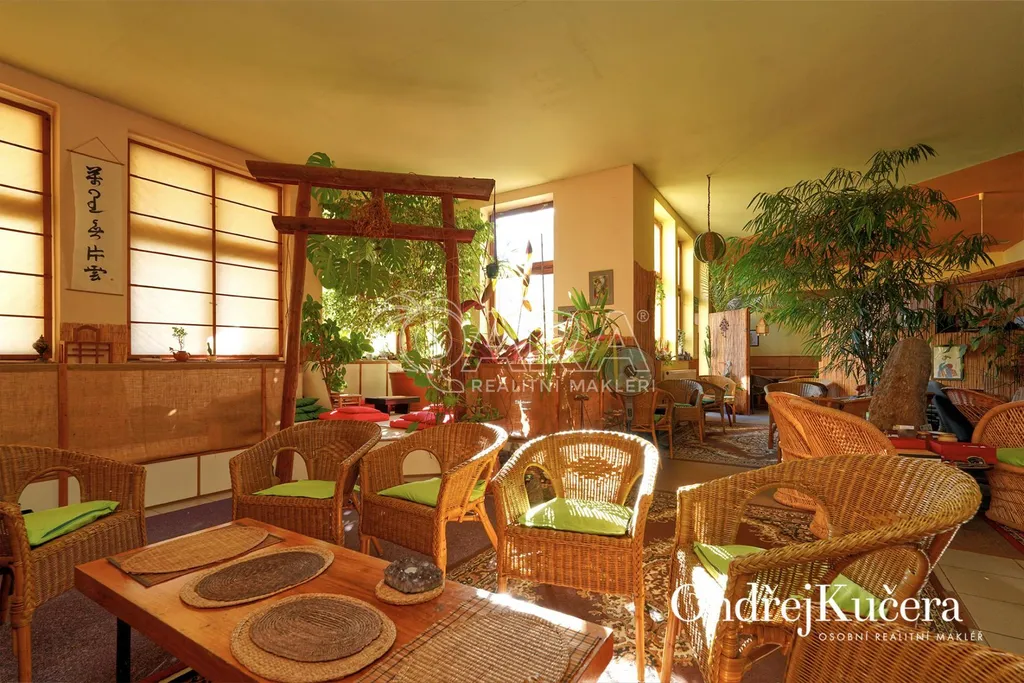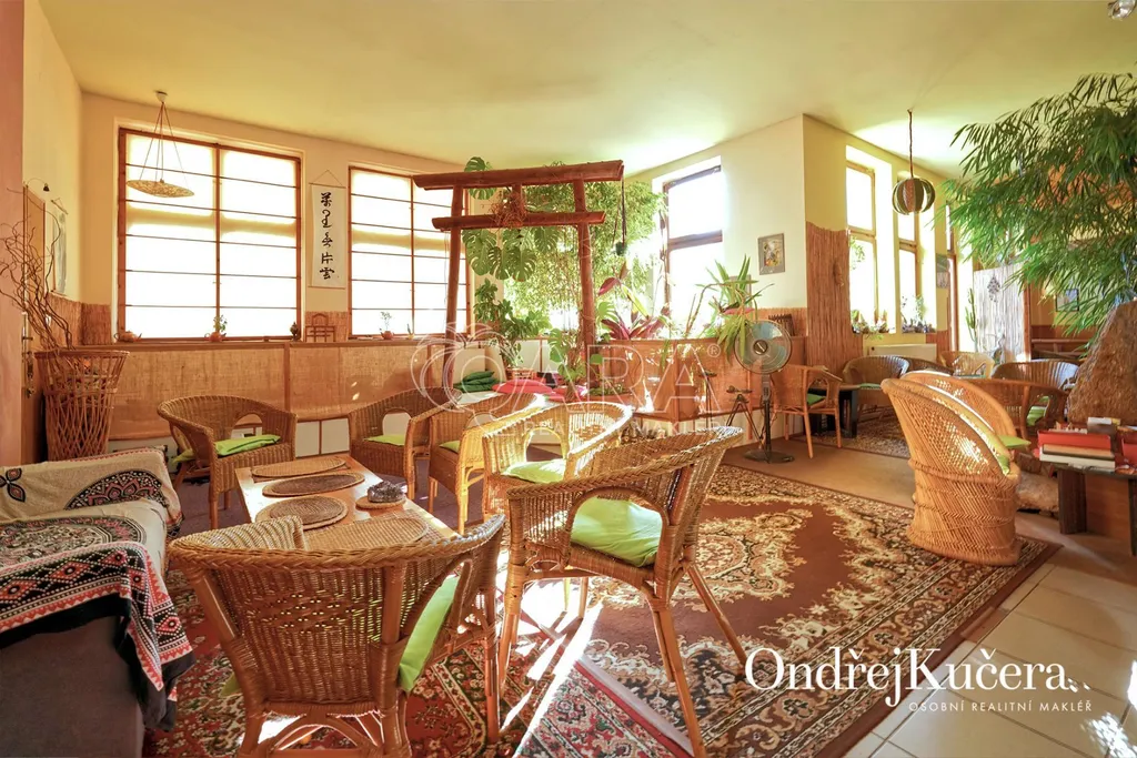 Dům je rozdělen na dvě části. V prvním vchodu se nachází restaurace s potravinami v přízemí. Nad ní je vyhlášená a skvěle hodnocená tradiční čajovna s velkou terasou. V posledním patře je 62 m² byt 2+kk a půda. Ve druhém vchodu je music bar v suterénu, pole gym a 41 m² byt v přízemí. V prvním patře je velký sál s točitým schodištěm do druhého patra s učební a zázemím. Ve druhém patře je i 90 m² byt s dispozicí 3+1. Celkově se jedná přibližně o 1.000 m² s velmi zajímavým uspořádáním.
