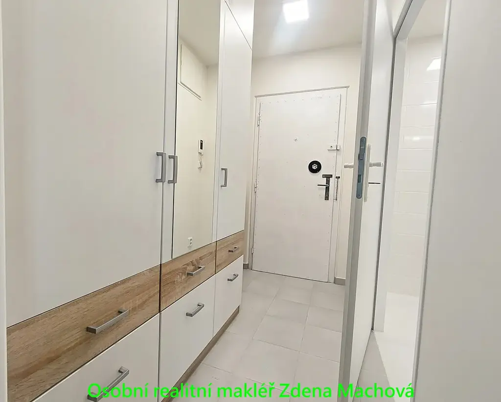 Dispozice bytu je prakticky řešena – obývací prostor je rozdělen na část s kuchyňskou linkou a klidovou zónu určenou ke spaní, kam se pohodlně vejde dvoulůžko i úložné prvky. Kuchyňská linka je vybavena varnou deskou a přípravou pro lednici s mrazákem. V předsíni se nachází vestavěné skříně, které nabízí dostatek úložného prostoru.