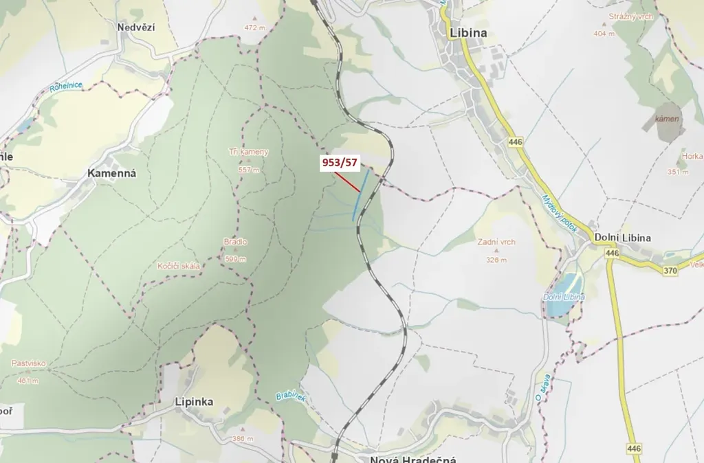 Lesní pozemek o výměře 6750 m2, parcelní číslo 953/57, podíl 1/1, katastrální území Nová Hradečná, obec Nová Hradečná, obec s rozšířenou působností Uničov, okres Olomouc, Olomoucký kraj.