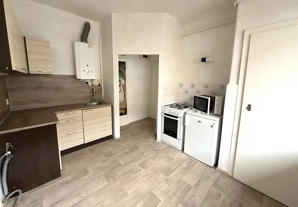Vstupními dveřmi vejdeme do bytu a ocitneme se v předsíni o výměře cca 1,62 m2. Kuchyně o velikosti cca 12,10 m2 je vybavena kuchyňskou linkou, lednicí, mikrovlnnou troubou a sporákem. U kuchyňské linky je přívod na pračku. Součástí kuchyně je spíž s regálem, pro úschovu například suchých potravin, spíž má výměru cca 0,66 m2. Z kuchyně dále vejdeme do hlavní obytné části o výměře 17,00 m2. Jedná se o atypický a moc pěkný pokoj. Koupelna o výměře cca 3,50 m2 je spojená s WC. Její součástí je vana, umyvadlo, zrcadlo a plynový ohřívač na teplou vodu.