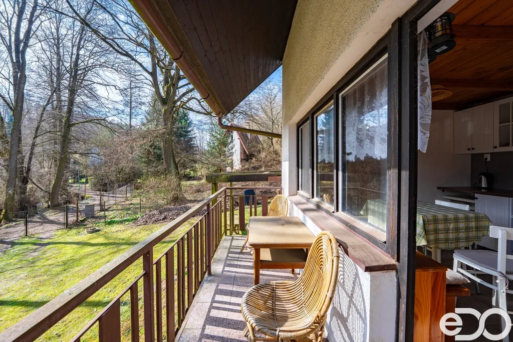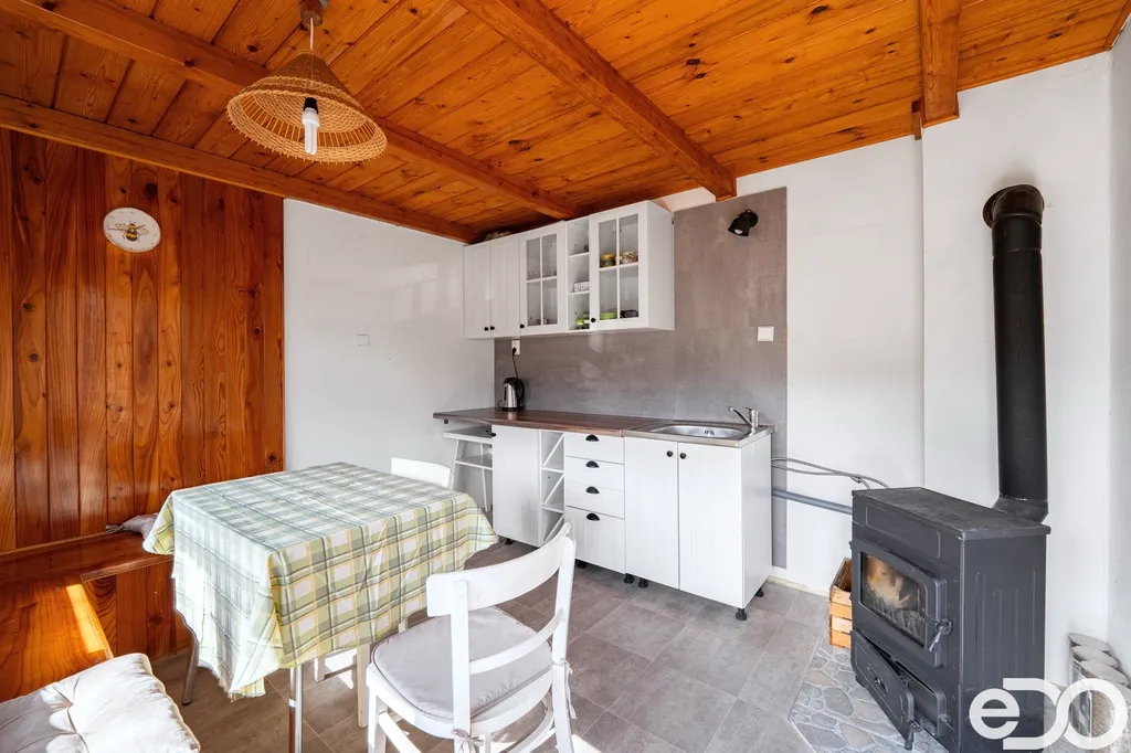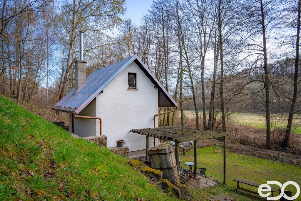 Chata je ve velmi dobrém stavu a nabízí přibližně 45 m² užitné plochy. V suterénu se nachází koupelna s vanou a umyvadlem a vedlejší praktická místnost sloužící jako úložný prostor. Hlavní obytné podlaží tvoří kuchyň s kuchyňskou linkou, dřezem a místem pro posezení u stolu, odkud je zároveň vstup do horní části chaty i na jihovýchodně orientovaný balkon. Právě tady se ukazuje největší kouzlo celého místa – výhled do zahrady a okolní zeleně, ranní světlo, klid a atmosféra, která člověka okamžitě nutí zpomalit. V podkroví pak najdete útulný prostor pro spaní, přesně takový, jaký od rekreační chaty v podobném prostředí čekáte.