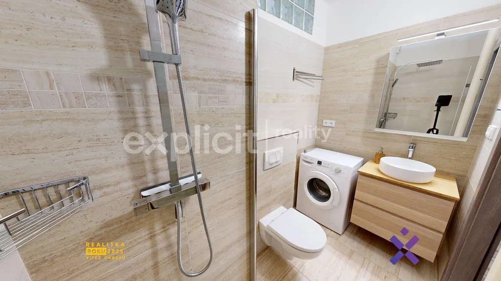 Byt je částečně vybaven – k dispozici je lednice, myčka a pračka, což zajišťuje komfortní bydlení bez nutnosti dalších větších investic.