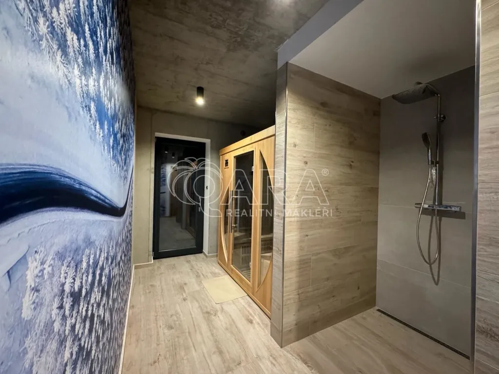 V koupelně najdete vanu, sprchový kout a toaletu. K tomu všemu patří také vlastní infrasauna a vedle ní druhý sprchový kout. Byt tedy nabízí jedinečný komfort bydlení, který si budete každý den užívat plnými doušky.