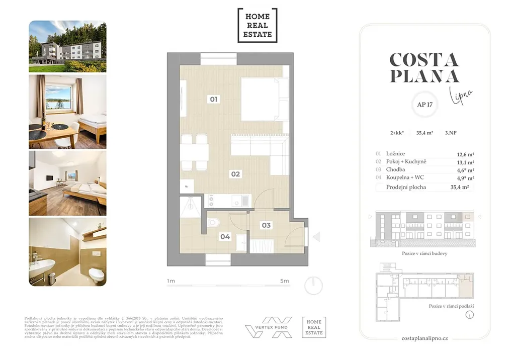 Home Real Estate si dovoluje exkluzivně nabídnout k prodeji plně vybavený designový apartmán o dispozici 1+kk (který se dá předělat na menší 1,5 / 2+kk ) s výhledem na Lipno, o podlahové ploše 35,4 m², který se nachází v 3NP projektu Costa Plana Lipno.