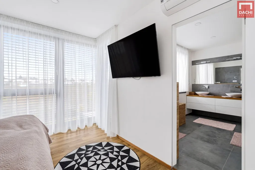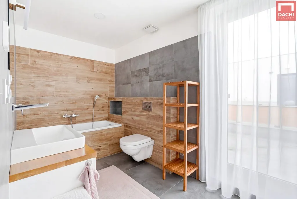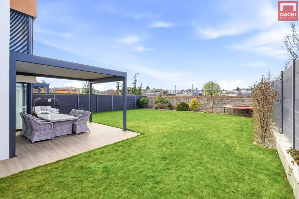 Dominantou domu je velkorysý obývací prostor propojený s kuchyní, který tvoří srdce celého domu. Díky západní orientaci je interiér krásně prosvětlený zejména v odpoledních hodinách a plynule navazuje na zahradu s vydlážděnou terasou. Ta je doplněna variabilní stínící pergolou a venkovními žaluziemi, které umožňují komfortní využití prostoru po celý den i rok. Zahrada je upravená tak, aby byla funkční a estetická ideální pro odpočinek i rodinné aktivity.