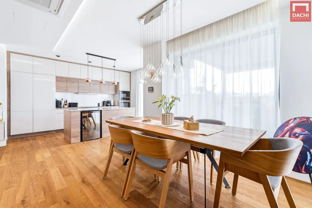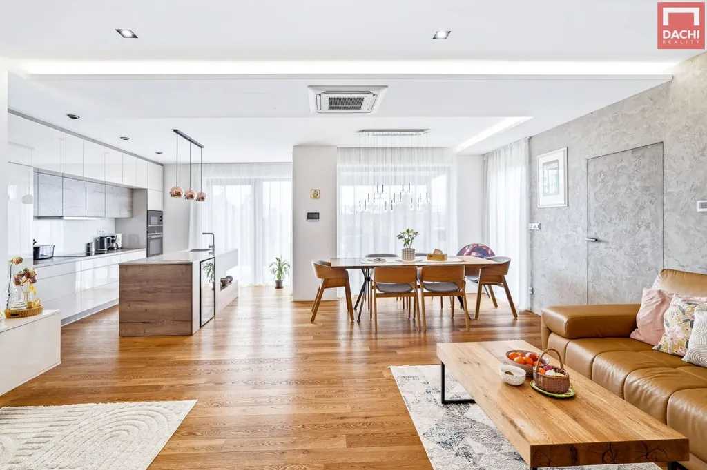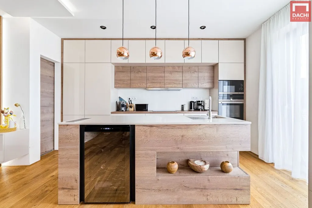 Kuchyň na míru je vybavena značkovými spotřebiči a dominuje jí velkorysý ostrůvek s vestavěnou vinotékou. Na kuchyň plynule navazuje prostorná potravinová spíž o velikosti 3,4 m. Obývací část pak příjemně dotváří krbová vložka.
