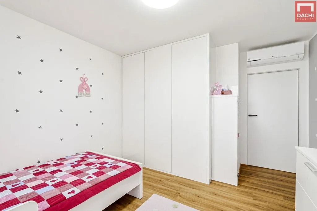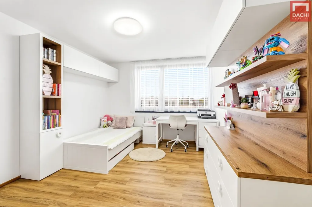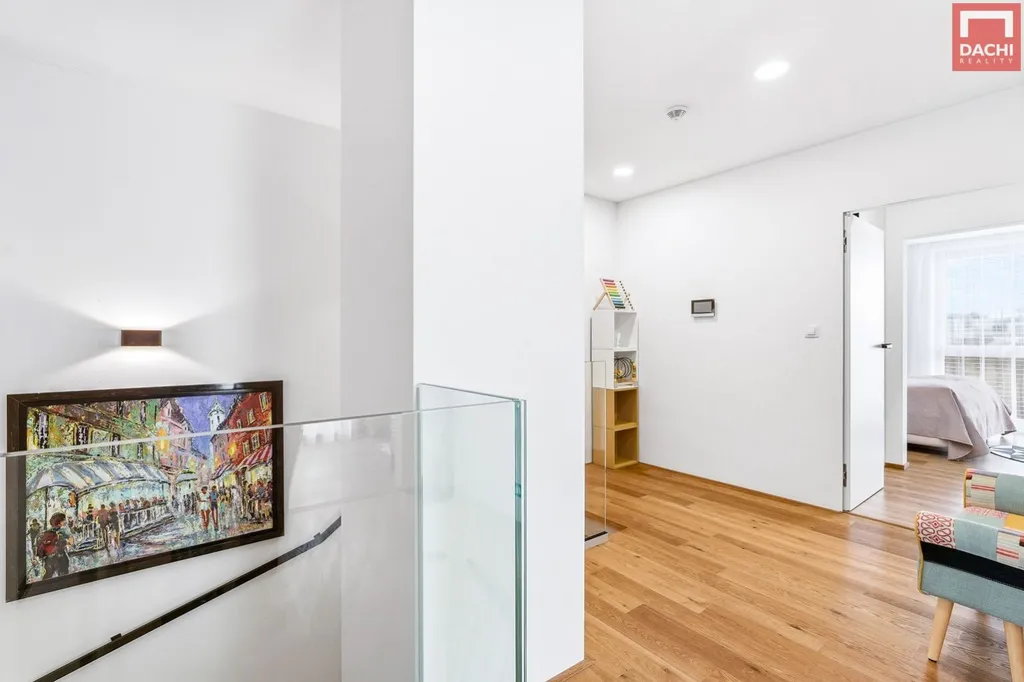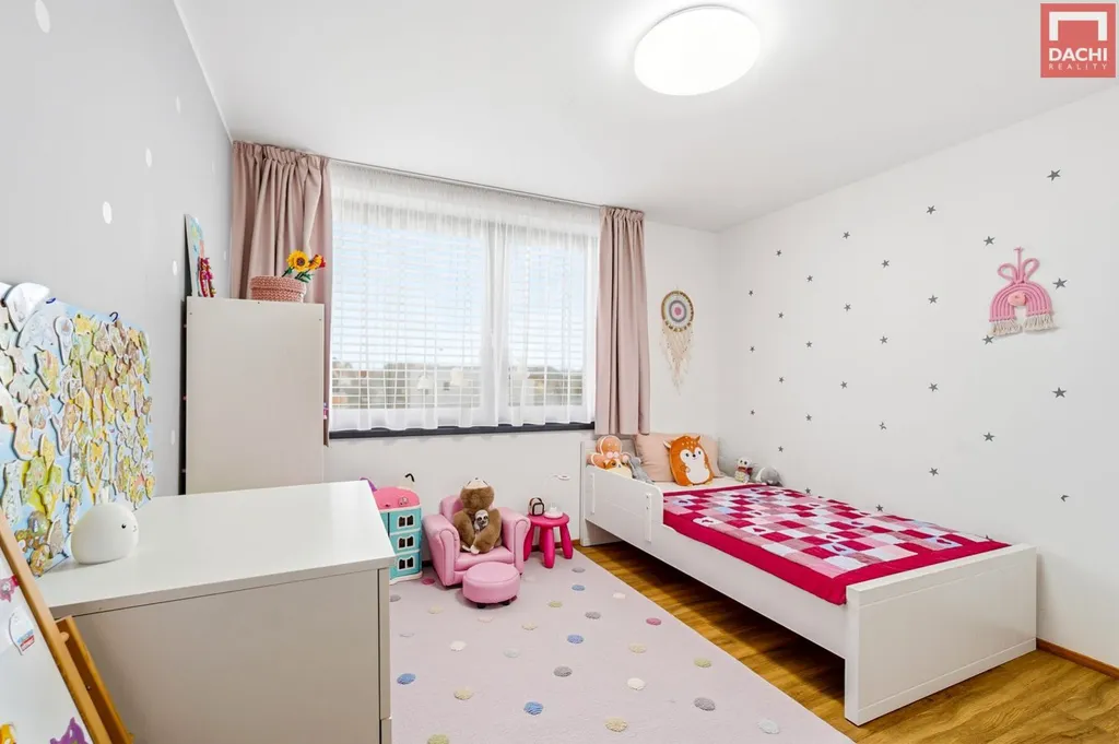 V patře je umístěna klidová zóna domu ložnice se západní orientací, vlastní koupelnou se sprchovým koutem a toaletou a navazující prostornou šatnou. Dále zde najdete dva dětské pokoje orientované na východ, vybavené vestavěným nábytkem. Dále je zde další koupelna s vanou a toaletou, která je k dispozici těmto pokojům.