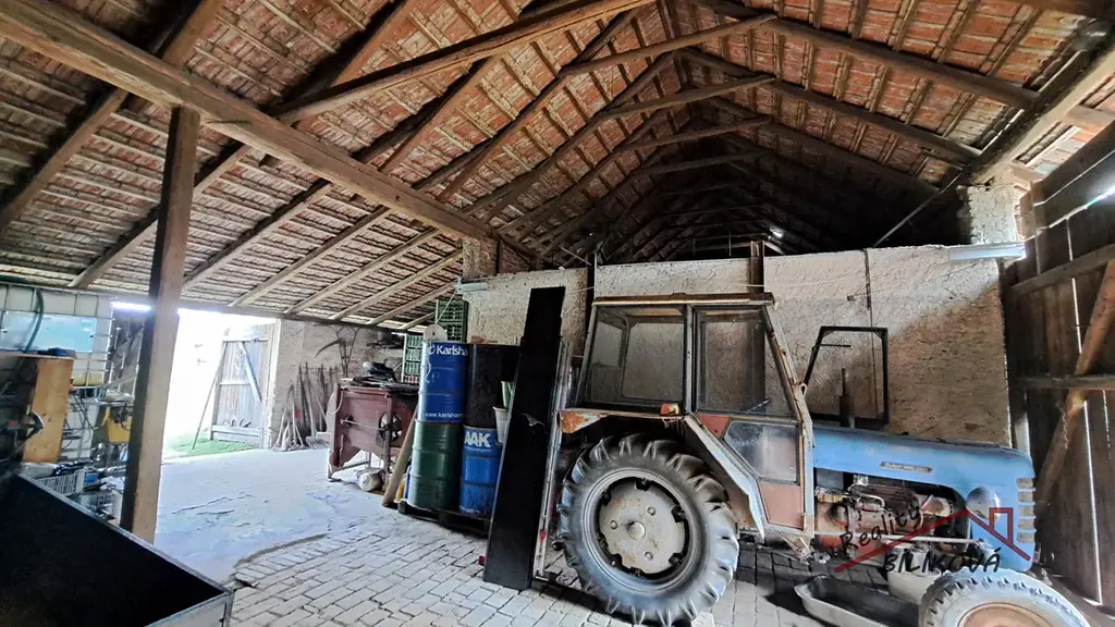 Jeden pozemek s domem a stodolou, druhý pozemek je zahrada. Lze použít jako dva stavební pozemky. Dům o dispozici 2+1, koupelna, samostatné WC, komora. IS: tlaková kanalizace, plynová přípojka, el. 220/380V. Vytápění akumulační kamna, kamna na tuhá paliva. Ohřev vody lázeňskými kamny. Zastavěná plocha domu je 90m2 a stodoly s garáží 230m2. Ve stodole sklep. Na pozemcích 2 studny.