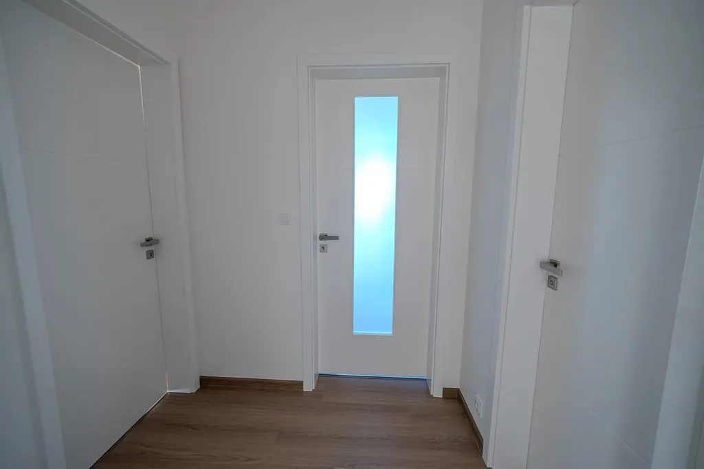 Dispozice bytu je řešena velmi prakticky – nabízí prostornou vstupní předsíň, kterou lze využít jako velkorysou šatnu, případně ji upravit a rozšířit tak byt o další pokoj či pracovní kout dle vašich potřeb.